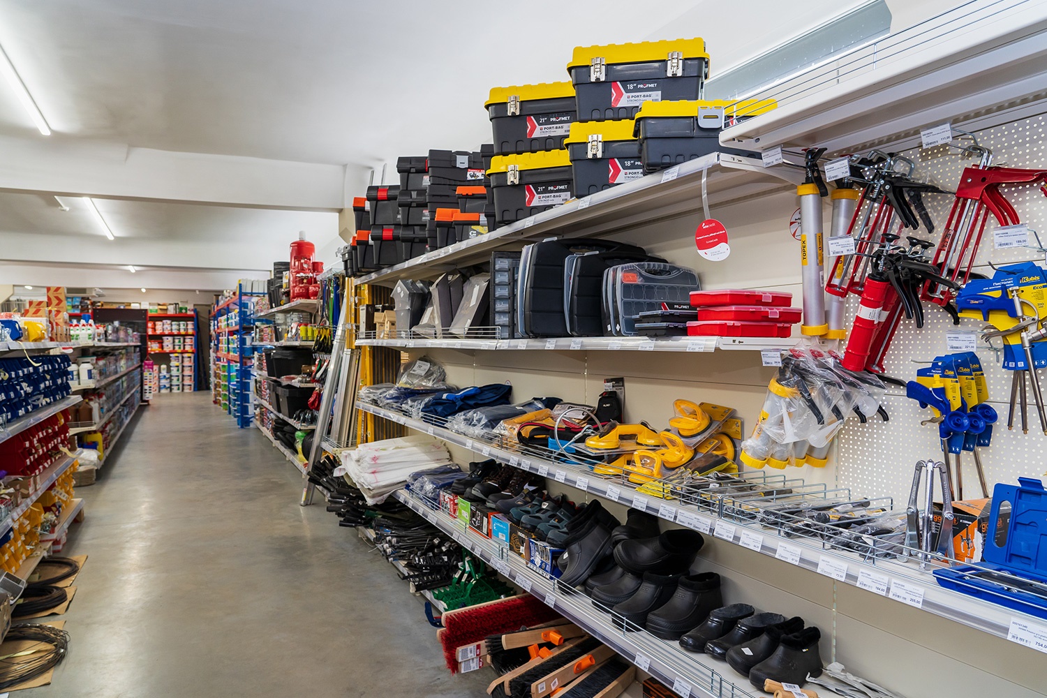 İş eldivenleri, baretler, maskeler, takım çantaları, el arabaları.